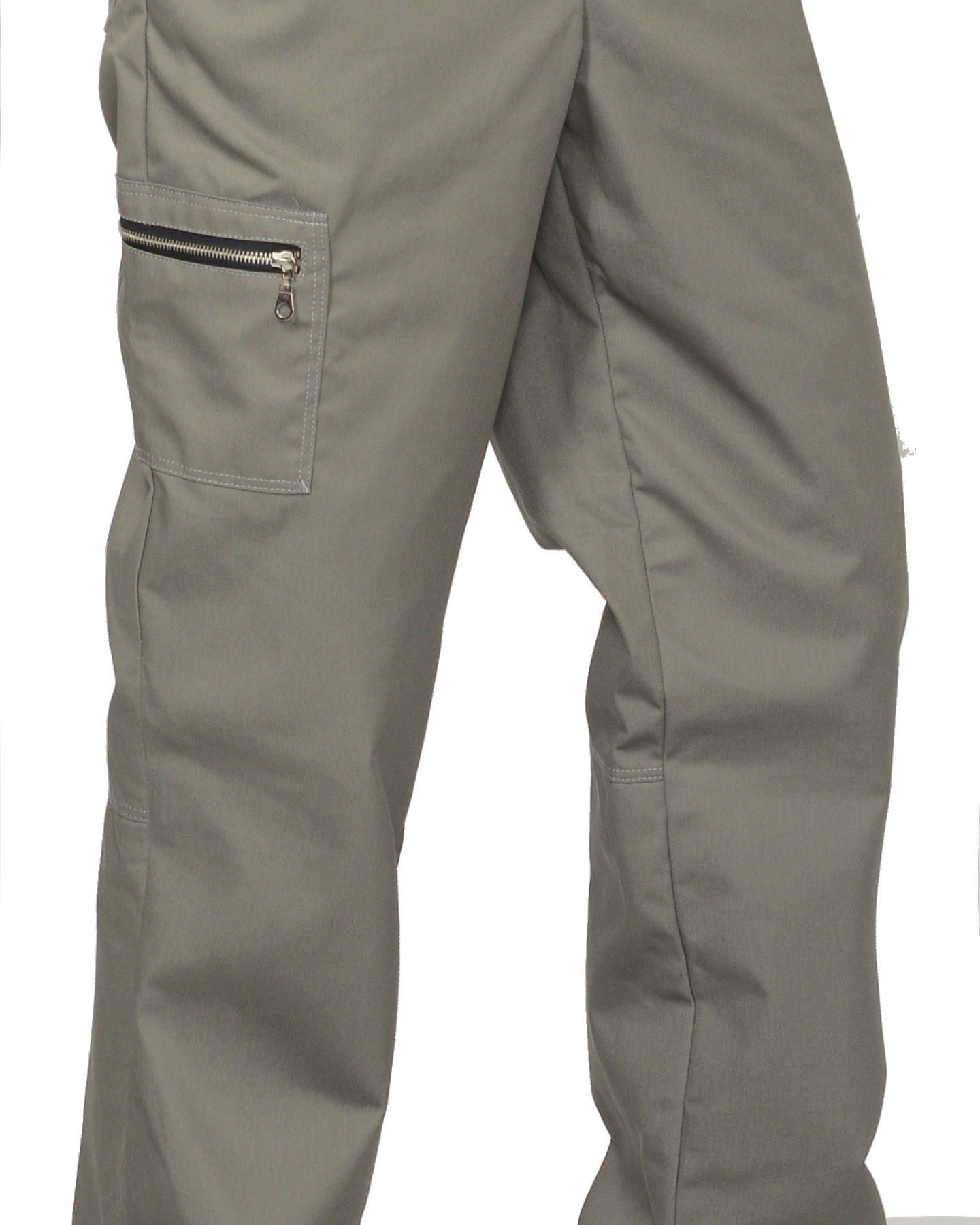 Брюки прямого покроя; с центральной застежкой гульфика на тесьму - «молния», с притачным поясом, застёгивающимся на кнопку; Передние половинки с внутренними боковыми карманами с наклонным входом, нижние углы карманов закреплены закрепками отделочными нитками и хольнитенами. Задние половинки с двумя накладными карманами с нижним объемом. На правом боковом шве брюк настрочен карман, с горизонтальным входом в карман, застёгивающийся на металлическую тесьму «молнию».