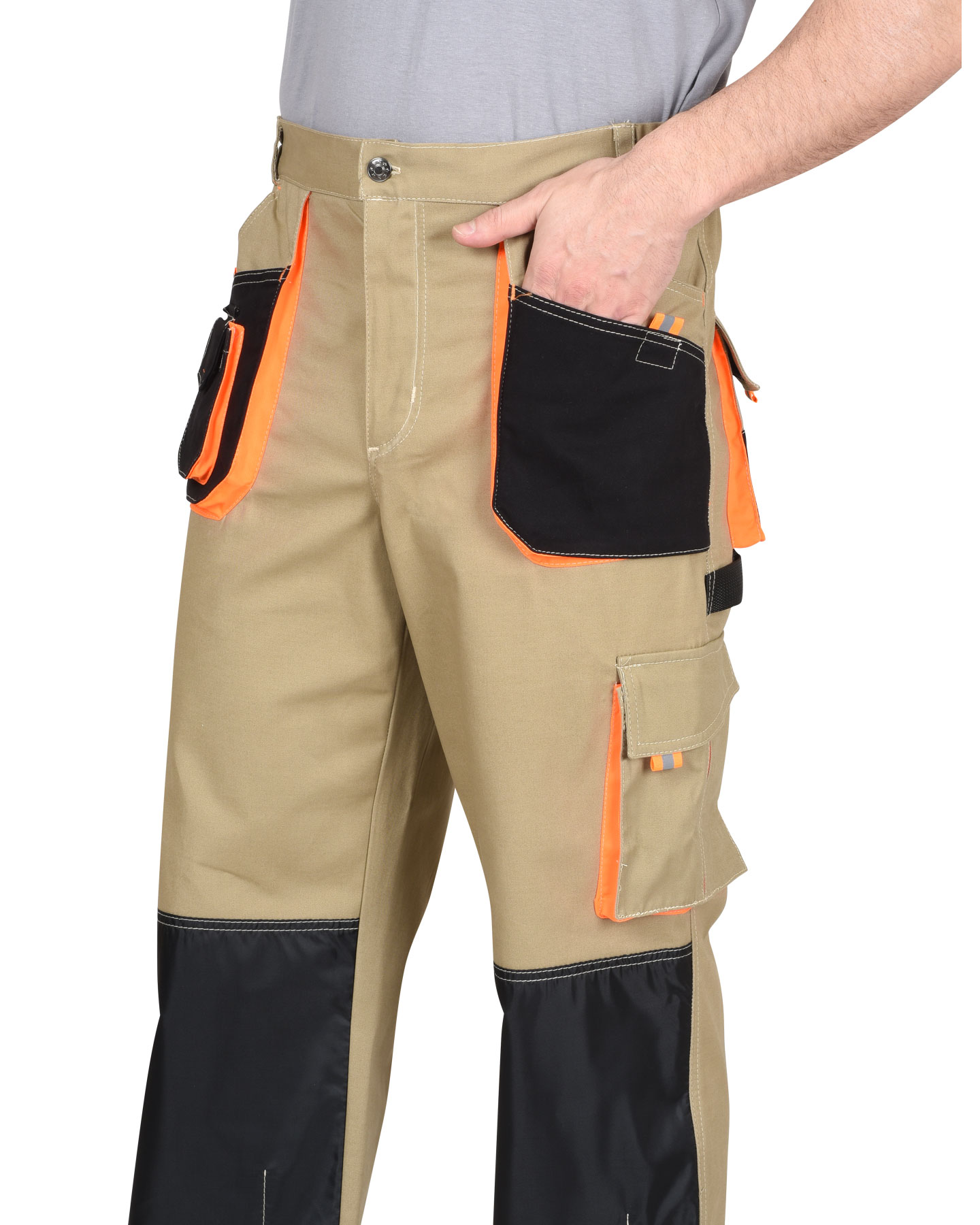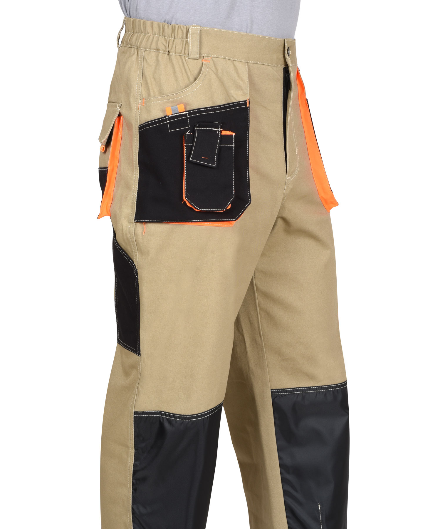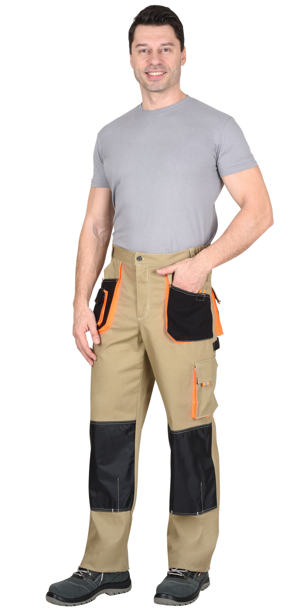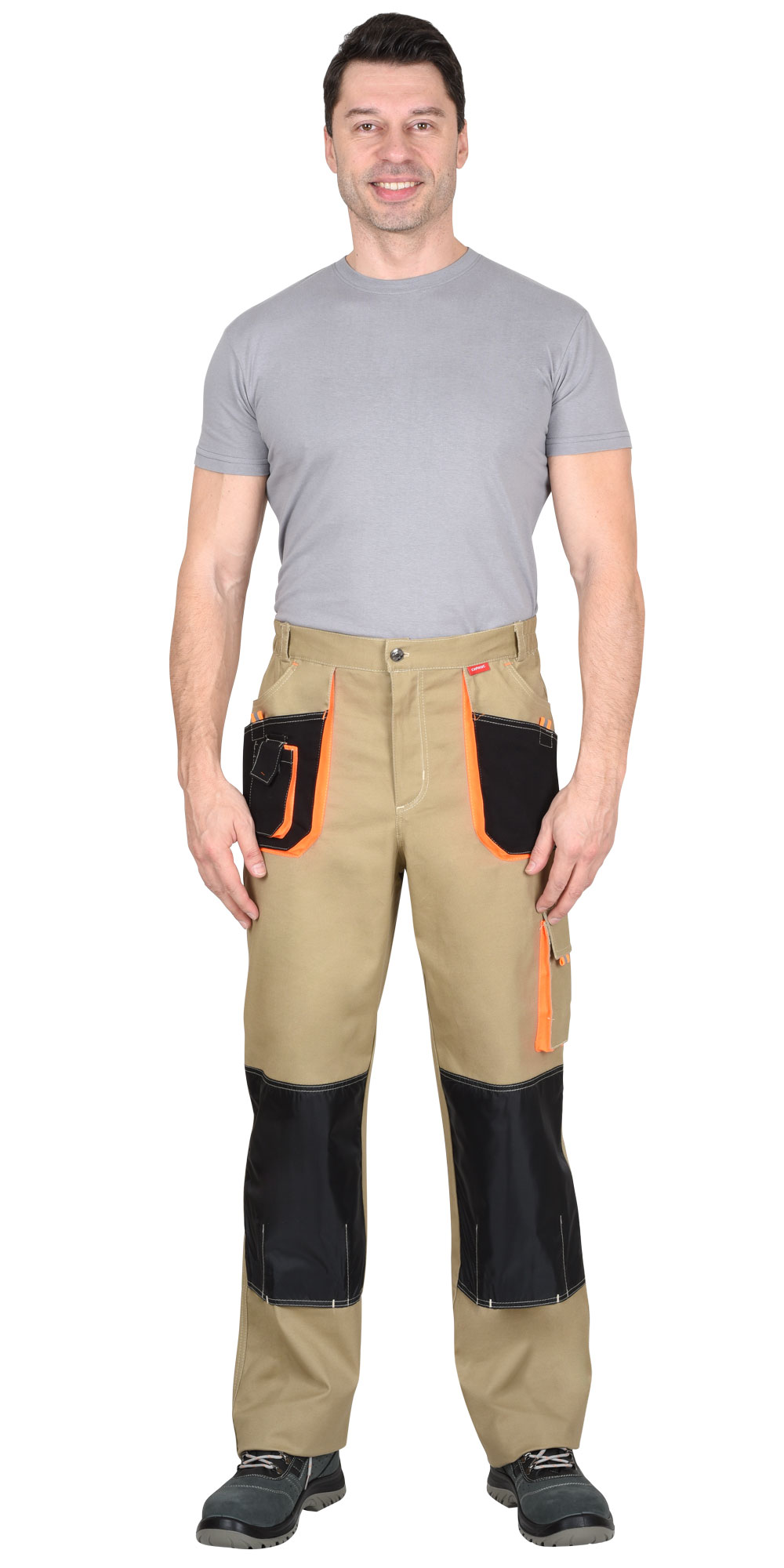 Брюки с застёжкой гульфика на молнию, с поясом на резинке, со шлевками, с накладными боковыми объемными карманами, с объемными наколенниками, с накладным объемным карманом на боковом шве с клапаном на липучке, двумя объемными карманами с клапанами на задних половинках, и карманами для инструментов.
