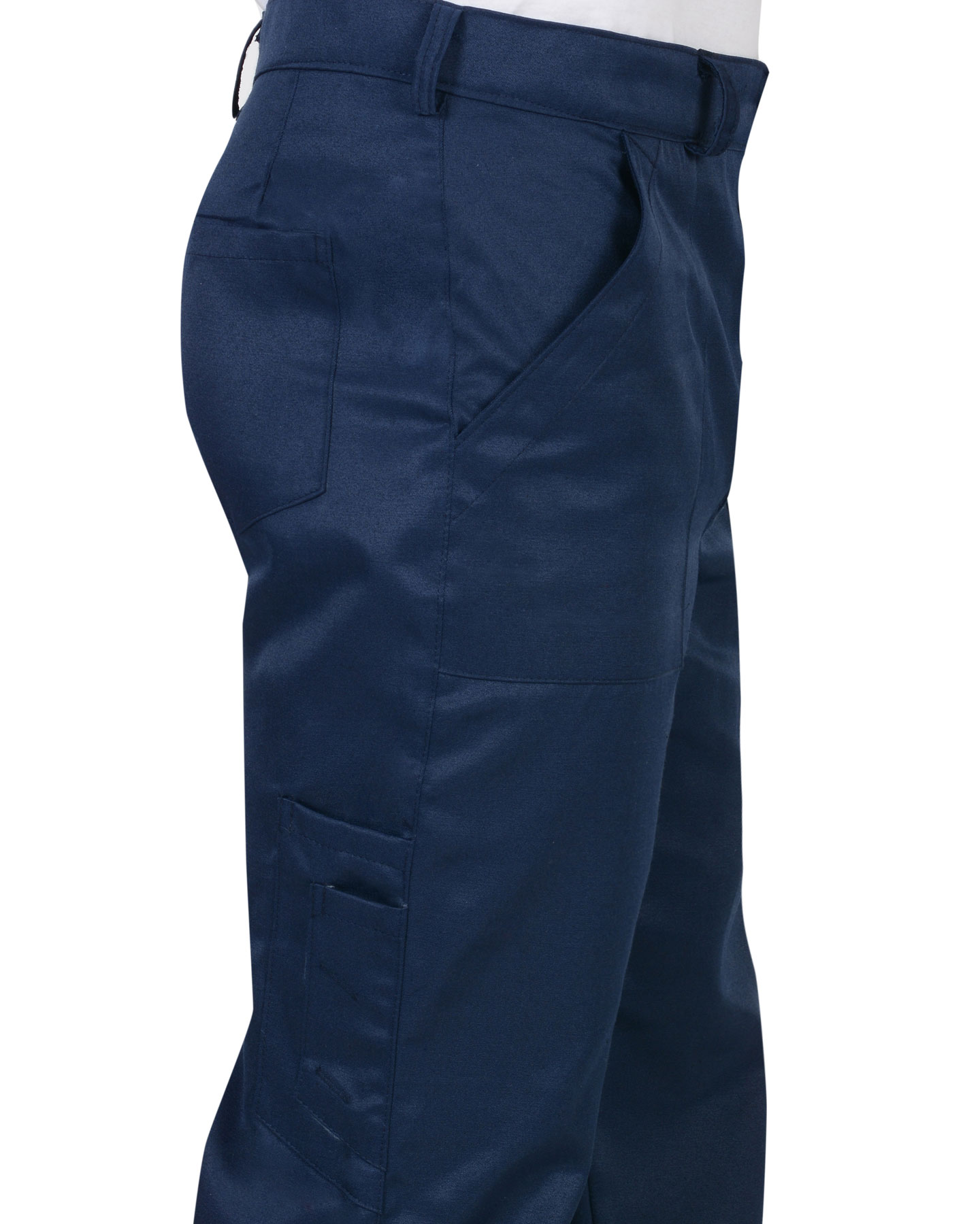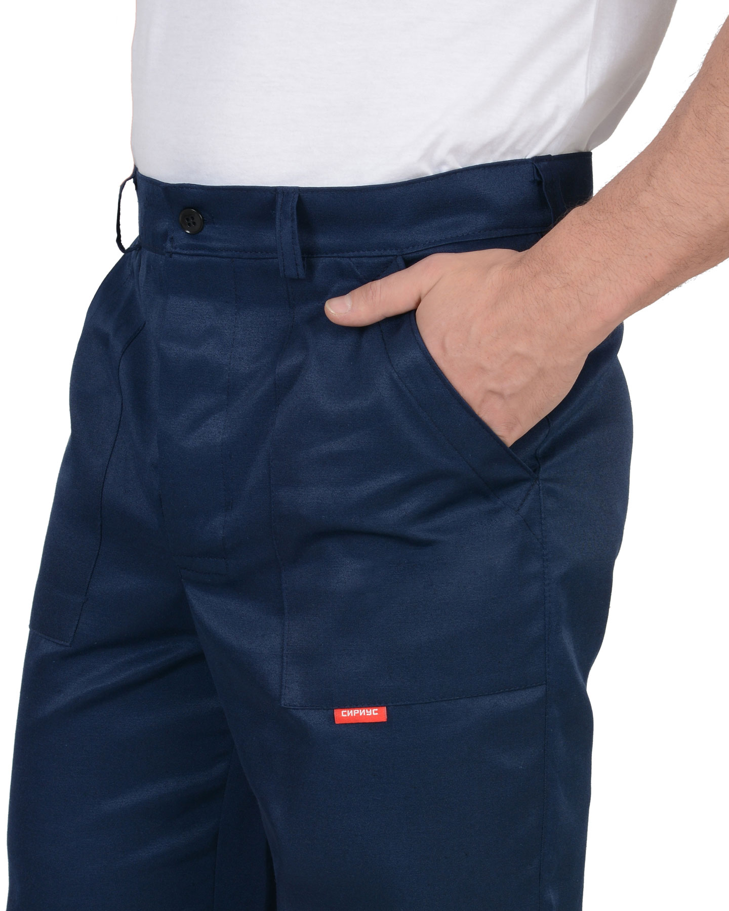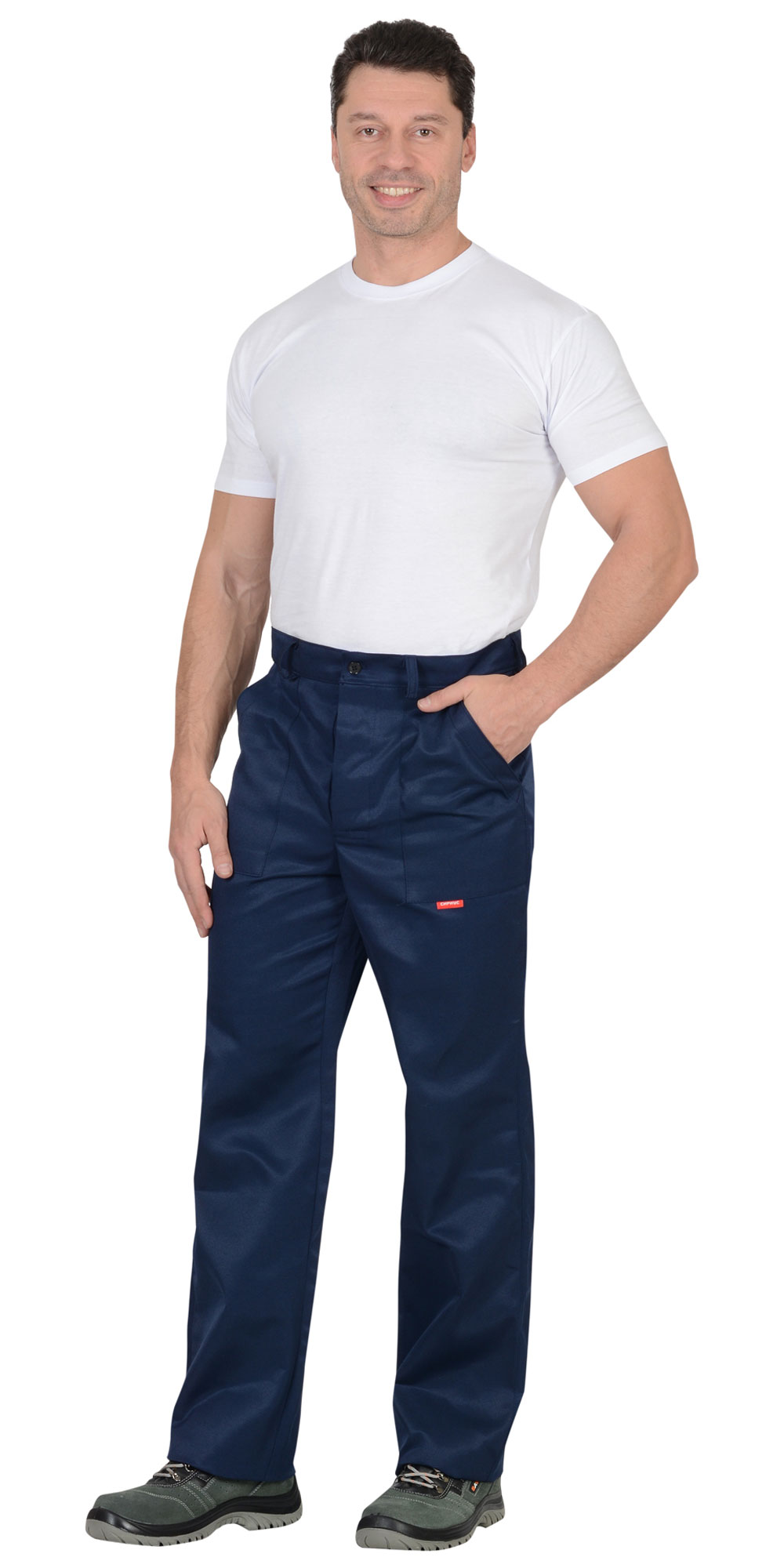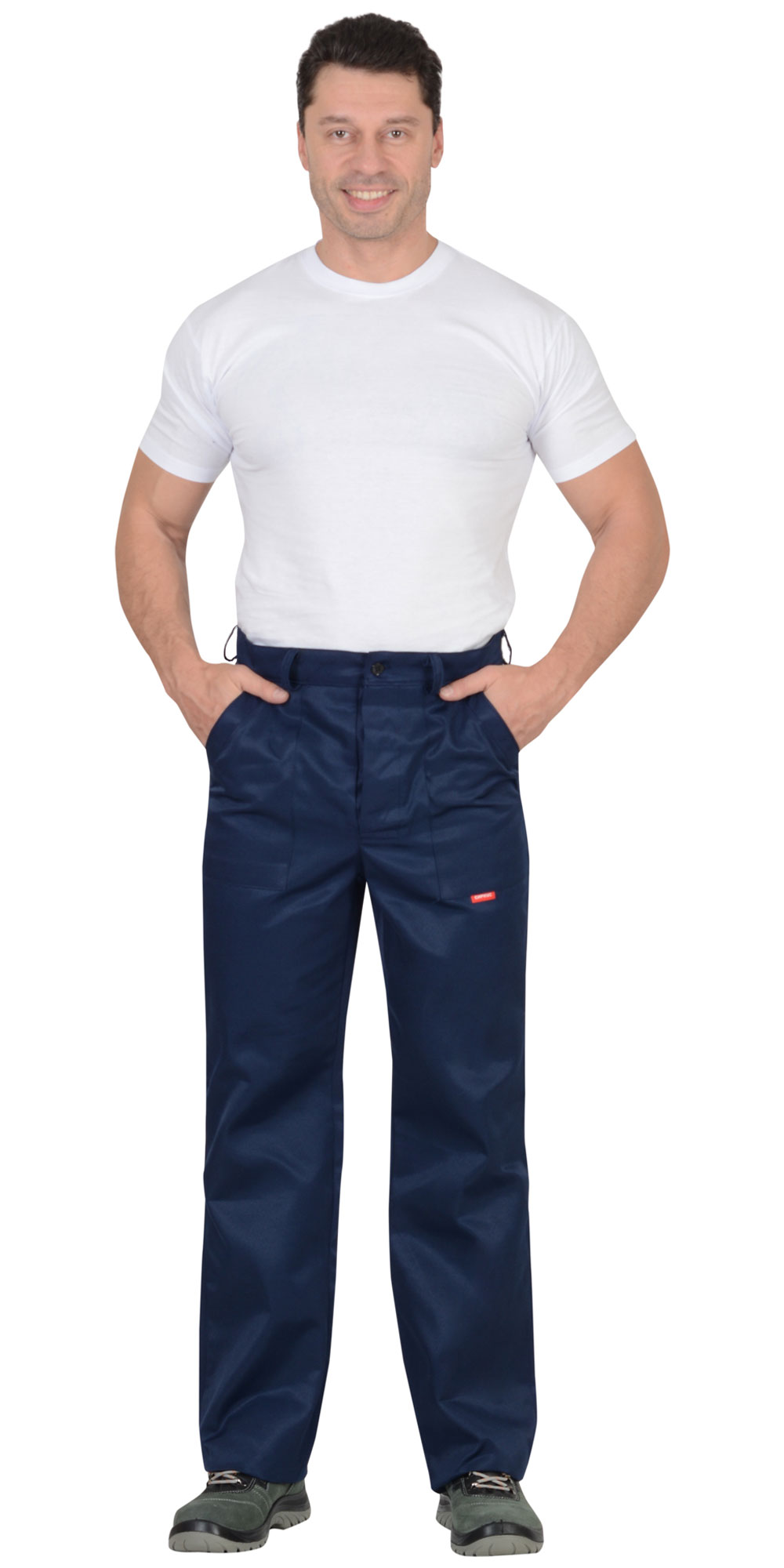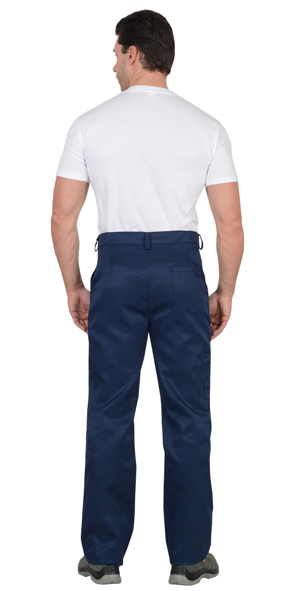 Брюки с заст.жкой спереди на 3 петли и 3пуговицы, с притачным поясом с 5 шлевками и заст.жкой на 1 петлю и пуговицу, с накладными боковыми карманами с наклонным входом, с накладным фигурным карманом и двумя (расположенными один на другом) накладными фигурными кармашками для инструментов на правой задней половинке. На маленьком кармашке 2 наклонные петли. ГОСТ 12.4.280-2014