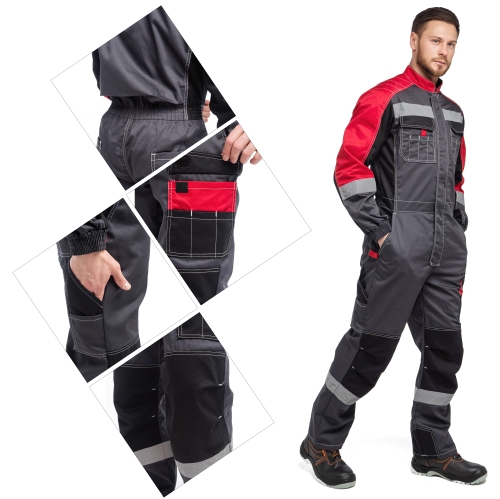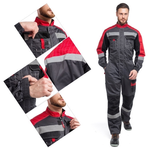 Комбинезон "ФОРМУЛА" изготовлен в соответствии с ГОСТ. Изделие закрывается на молнию, закрытую ветрозащитной планкой на липучку и оснащено фигурным воротником-стойкой. В области подмышечных впадин находится вентиляционные отверстия из сетки. На модели расположены верхние накладные фигурные карманы с фигурными клапанами на липучку. Изделие оснащено держателем-полукольца для бейджа. Эластичной резинка по талии спинки обеспечивает комфортную посадку. На комбинезоне расположены задние фигурные накладные карманы, карманы под инструменты и накладной карманом с фигурным клапаном на липучку на боковом шве. Усилительными накладками в области коленей и по шаговому шву обеспечивают дополнительную защиту. Для безопасной работы сотрудник в комбинезоне "ФОРМУЛА" предусмотрена световозвращающая лента шириной 50 мм.