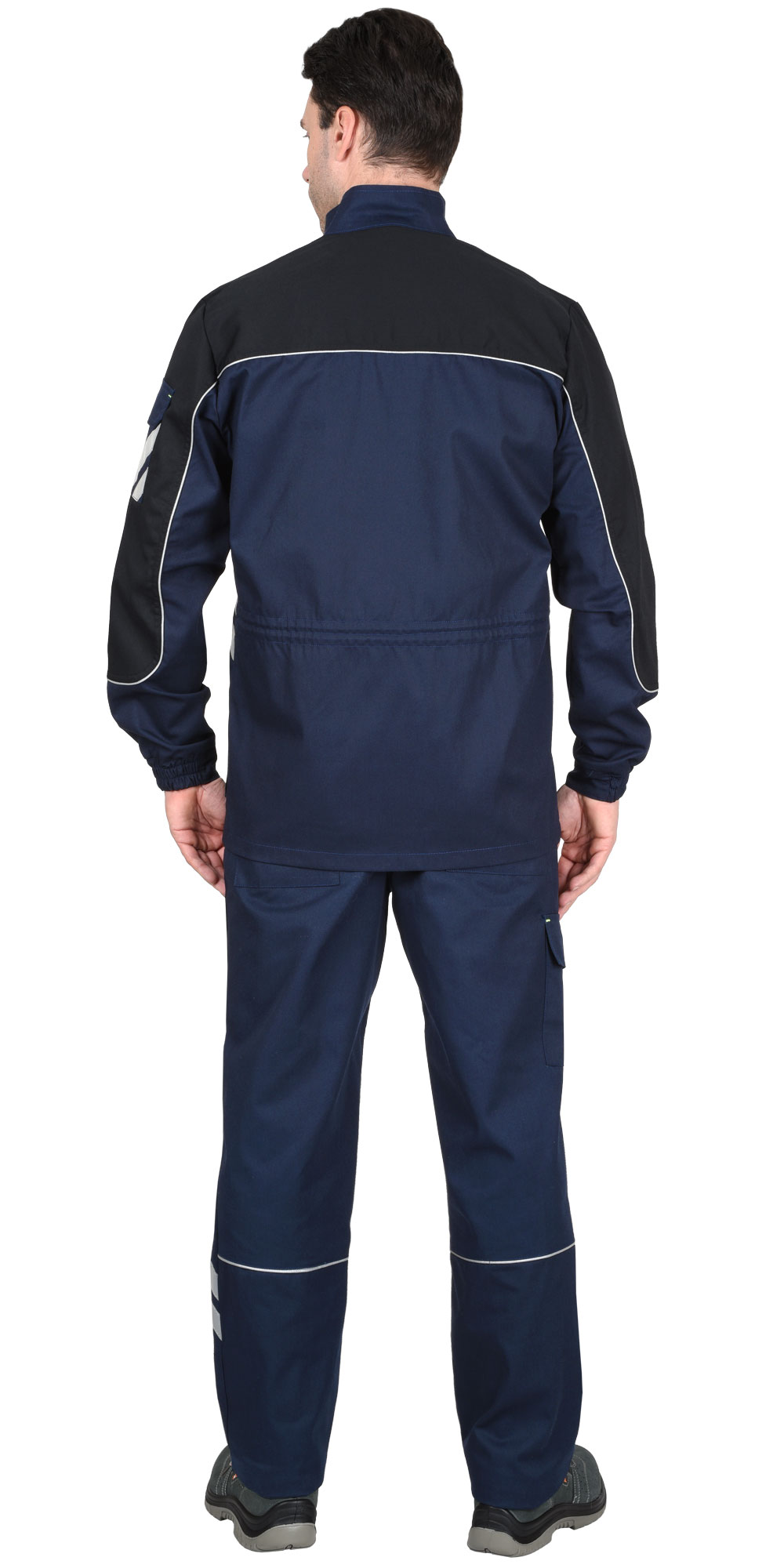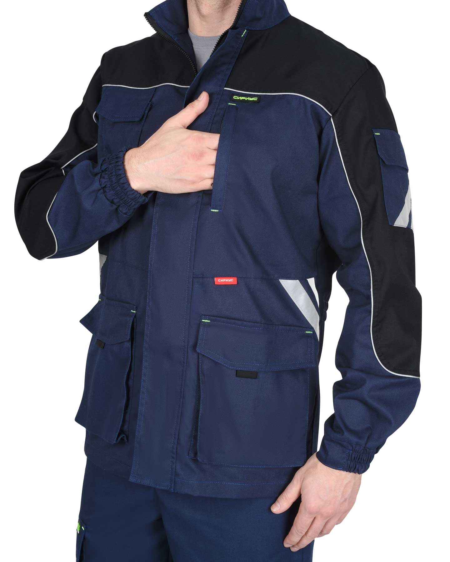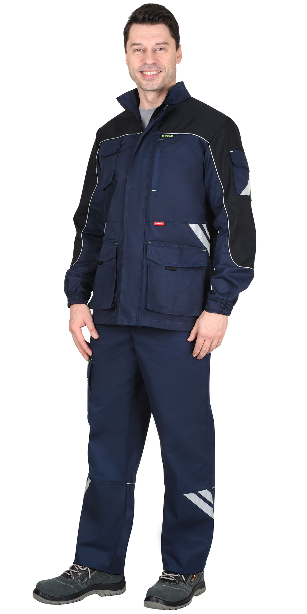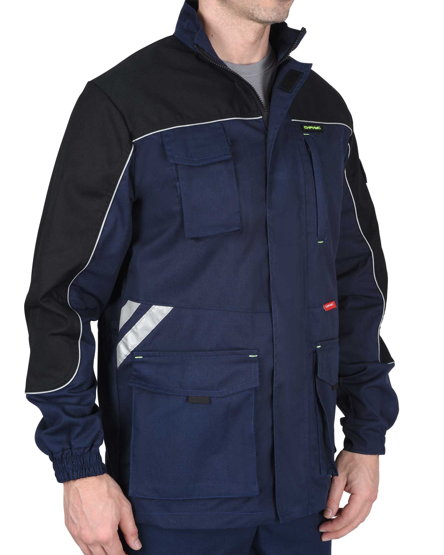 Куртка прямого силуэта, с центральной застежкой на молнию, накрытую ветрозащитным клапаном, с воротником стойка, с различными многофункциональными карманами, с элементами из СВ канта и СОП, обеспечивающие безопасность работы в условиях пониженной видимости. ГОСТ 27575-87
