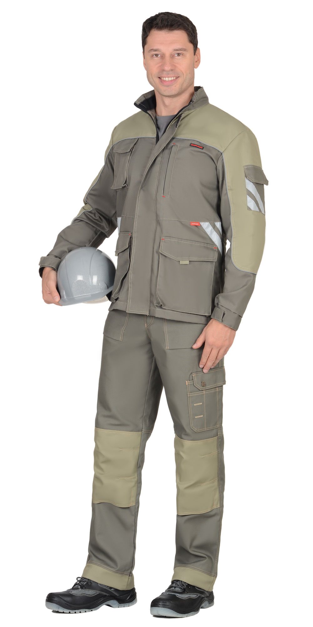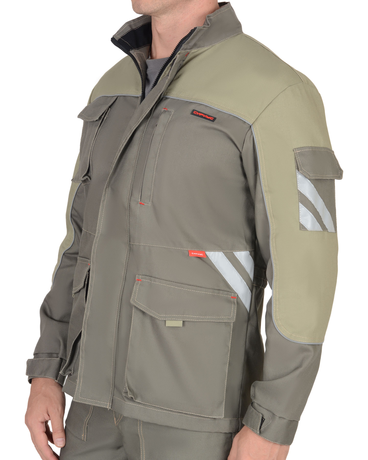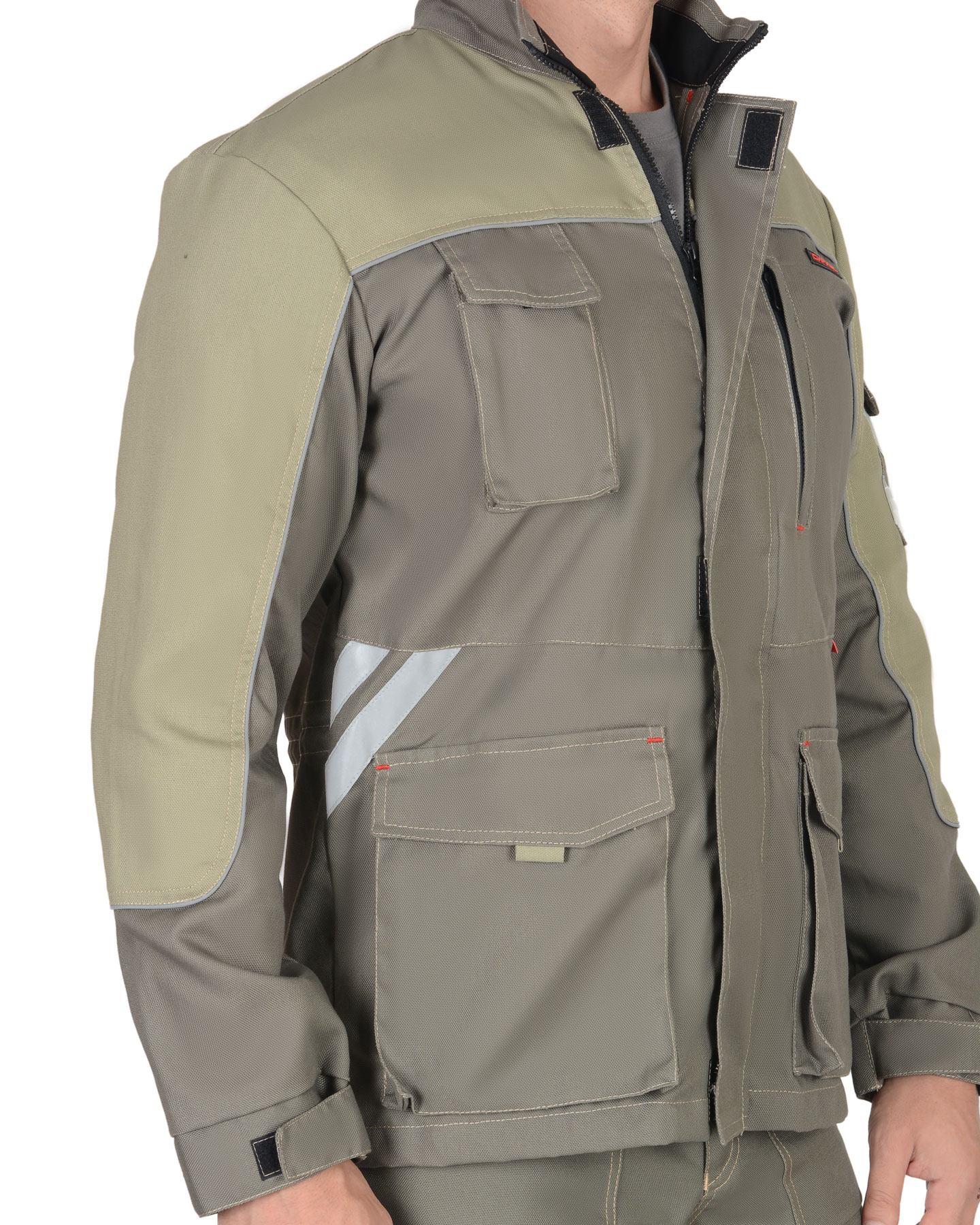Куртка прямого силуэта, с центральной заст.жкой на тесьму - «молния» накрытую ветрозащитным клапаном на липучках, воротником стойка, верхними и нижними накладными карманами с клапанами и одним нагрудным прорезным карманом листочка – на тесьму «молния». На левом рукаве накладной карман с клапаном. В куртку втачивается СВ - кант, и настрачивается СОП шириной 25мм для обозначения сигнальной видимости.