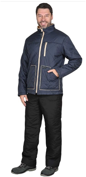Куртка мужская, утеплённая, стёганная с утеплителем в виде ромбов, с притачной флисовой подкладкой контрастного цвета. Куртка удлиненная, прямого силуэта, с воротником стойка, с центральной застёжкой на тесьму - «молния», с нижними накладными карманами и нагрудным карманом на левой полочке. Рукава втачные, одношовные.